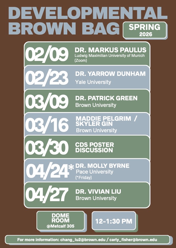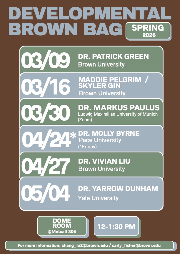 - Stay tuned for further information about their talks! If you have any questions about the Developmental Brown Bag Seminar Series, please email the DBB student organizers, Amy Lu (chang_lu2@brown.edu) and Carly Fisher (carly_fisher@brown.edu).